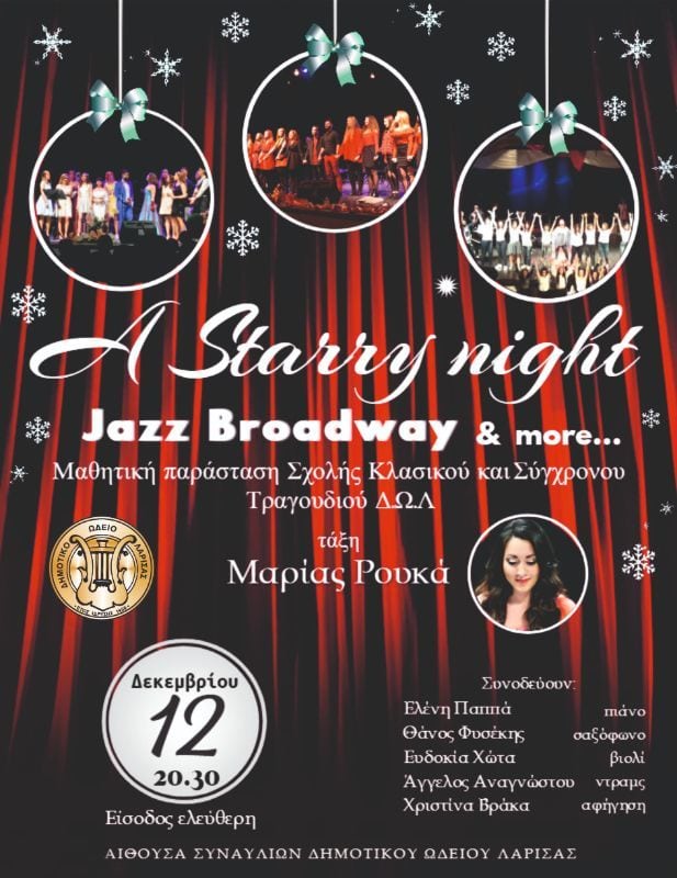 Το δημοτικό ωδείο Λάρισας, η Σχολή Κλασικού & Σύγχρονου Τραγουδιού ΔΩΛ και η υπεύθυνη καθηγήτρια της τάξης Μαρία Ρουκά, σας προσκαλούν την Τετάρτη 12 ΔΕΚΕΜΒΡΊΟΥ 2018 στις 8:30μμ στη μουσικοθεατρική παράσταση ” A Starry Night “.