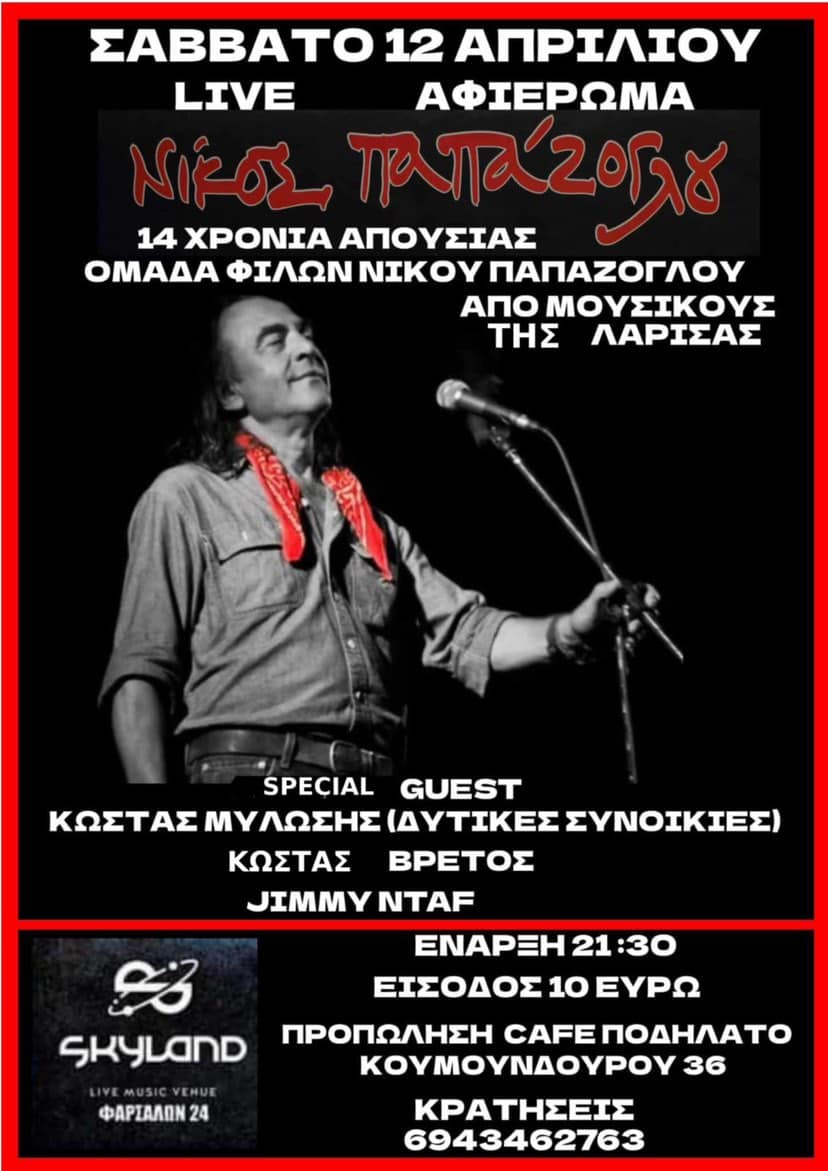 Η Ομάδα Φίλων Νίκου Παπάζογλου και μουσικοί της Λάρισας ενώνουν τις δυνάμεις τους για να τιμήσουν τη μνήμη του μεγάλου δημιουργού, Νίκου Παπάζογλου, σε ένα ξεχωριστό live αφιέρωμα που θα πραγματοποιηθεί το Σάββατο 12 Απριλίου στο Skyland (Φαρσάλων 24, Λάρισα).