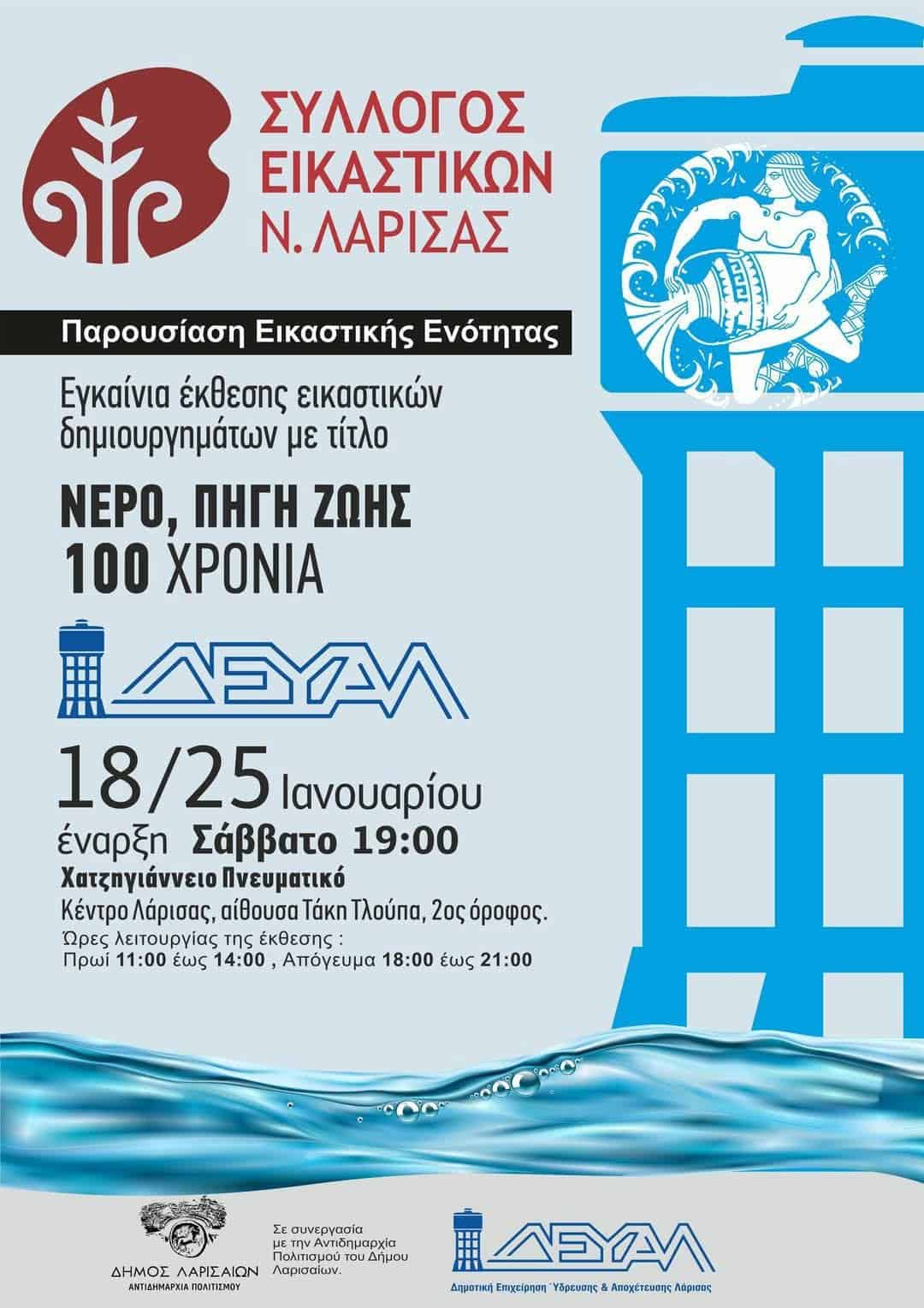 Ο Σύλλογος Εικαστικών Ν. Λάρισας, σε συνεργασία με την Δ.Ε.Υ.Α.Λ. Λάρισας, που κλείνει φέτος τα 100 Χρόνια Λειτουργίας της και την Αντιδημαρχία Πολιτισμού του Δήμου Λαρισαίων, διοργανώνουν  έκθεση εικαστικών δημιουργημάτων με τίτλο,