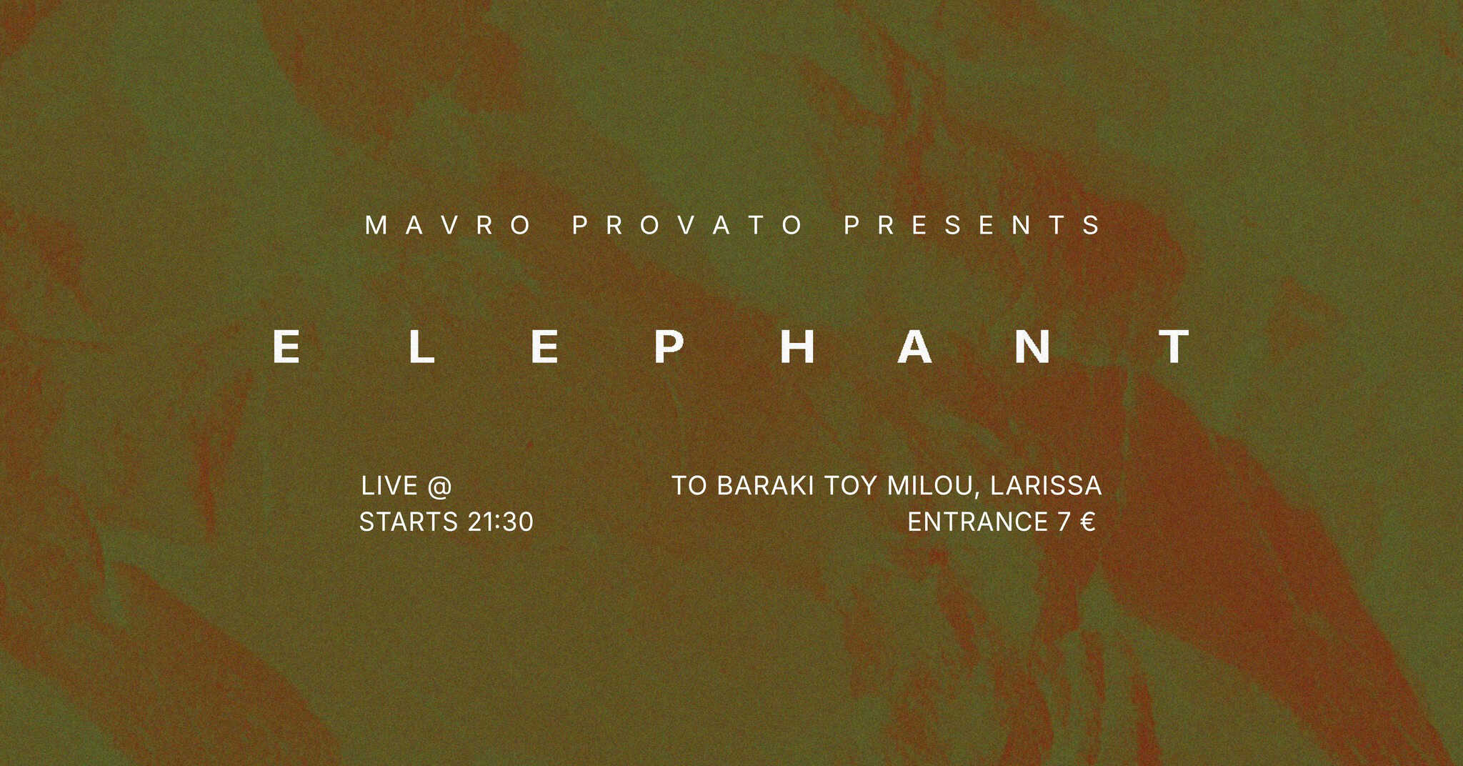 Οι Elephant υπάρχουν από το 2018. Νιώθουν πως παίζουν alternative rock, χωρίς να το έχουν συνειδητοποιήσει απόλυτα. Δημιουργήθηκαν ένα από τα πολλά απογεύματα σε ένα στούντιο στα Γιάννενα, κάπου ανάμεσα από συζητήσεις για μουσική και δημιουργία, αναζητώντας τρόπους για να υπάρξουν συμβαδίζοντας με την πραγματικότητα. Λίγο καιρό μετά, δημιούργησαν τον full-length δίσκο ‘A Better Me’ που κυκλοφόρησε το καλοκαίρι του 2022. Περισσότερο από οτιδήποτε, έχουν ανάγκη την ενέργεια του live γι΄ αυτό και τα τελευταία δύο χρόνια έχουν συνυπάρξει με πολλούς καλλιτέχνες, διοργανώσεις και φεστιβάλ ανά την Ελλάδα. Με αφορμή την κυκλοφορία της νέας τους δουλειάς θα βρίσκονται σε εγχώριο τουρ τον χειμώνα και την άνοιξη του 2025.