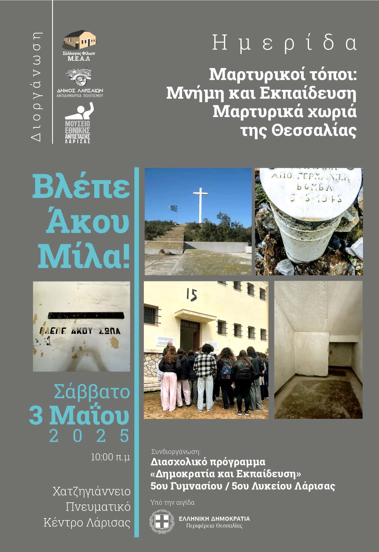 Ημερίδα με θέμα: «Μαρτυρικοί τόποι: Μνήμη και Εκπαίδευση / Μαρτυρικά χωριά της Θεσσαλίας», συνδιοργανώνουν, το Σάββατο 3 Μαΐου 2025, στο Χατζηγιάννειο Πνευματικό Κέντρο Λάρισας, ο Σύλλογος Φίλων Μουσείου Εθνικής Αντίστασης Λάρισας, η Αντιδημαρχία Πολιτισμού του Δήμου Λαρισαίων, το Μουσείο Εθνικής Αντίστασης Λάρισας σε συνεργασία με το διασχολικό πρόγραμμα «Δημοκρατία και Εκπαίδευση» των 5ου Γυμνασίου και 5ου Λυκείου Λάρισας.