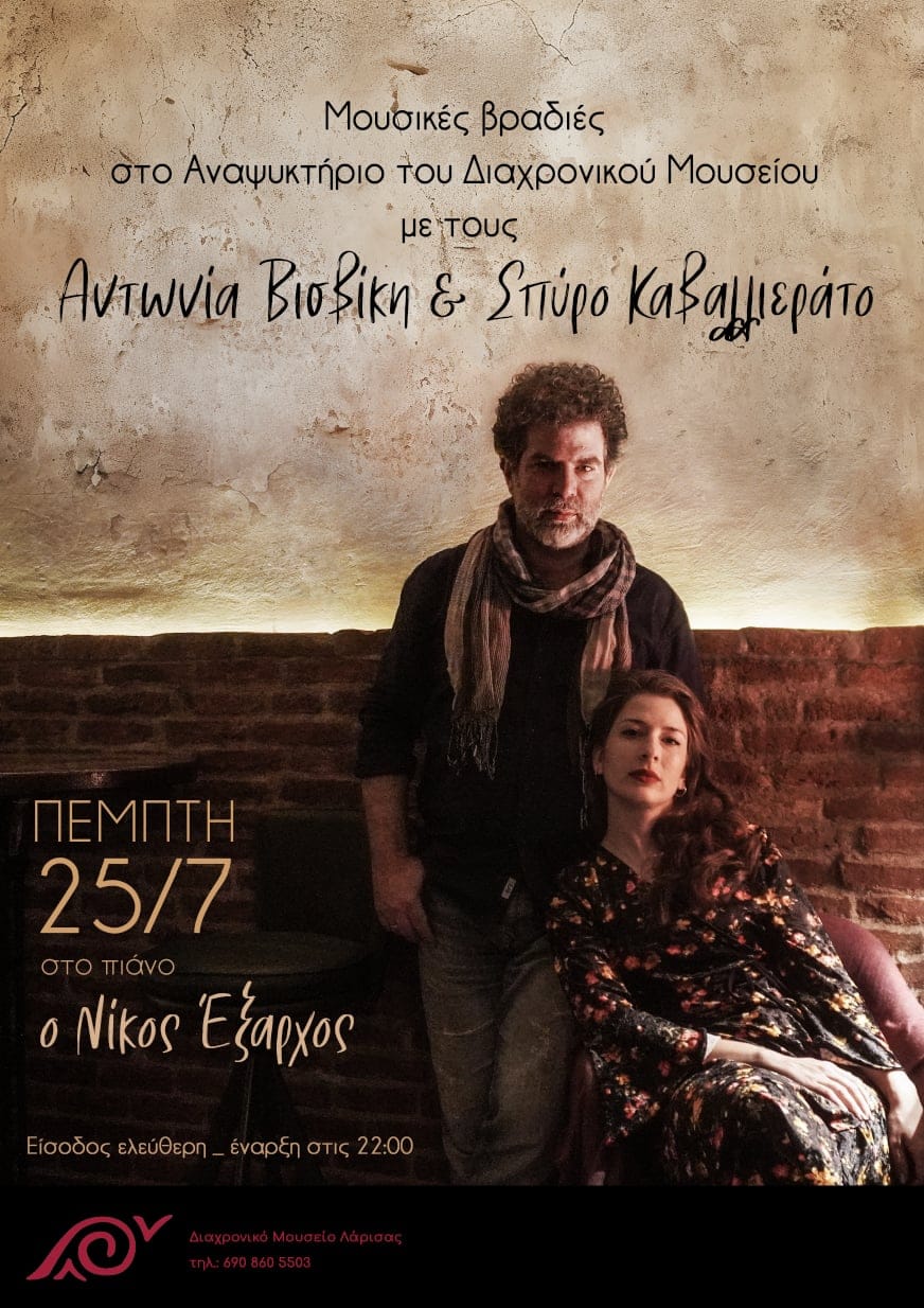 Σήμερα Πέμπτη, 25/7, στις 10 μ.μ. το Αναψυκτήριο του Διαχρονικού Μουσείου διοργανώνει Μουσική βραδιά με την Αντωνία Βισβίκη, τον Σπύρο Καβαλλιεράτο και τον Νίκο Έξαρχο.