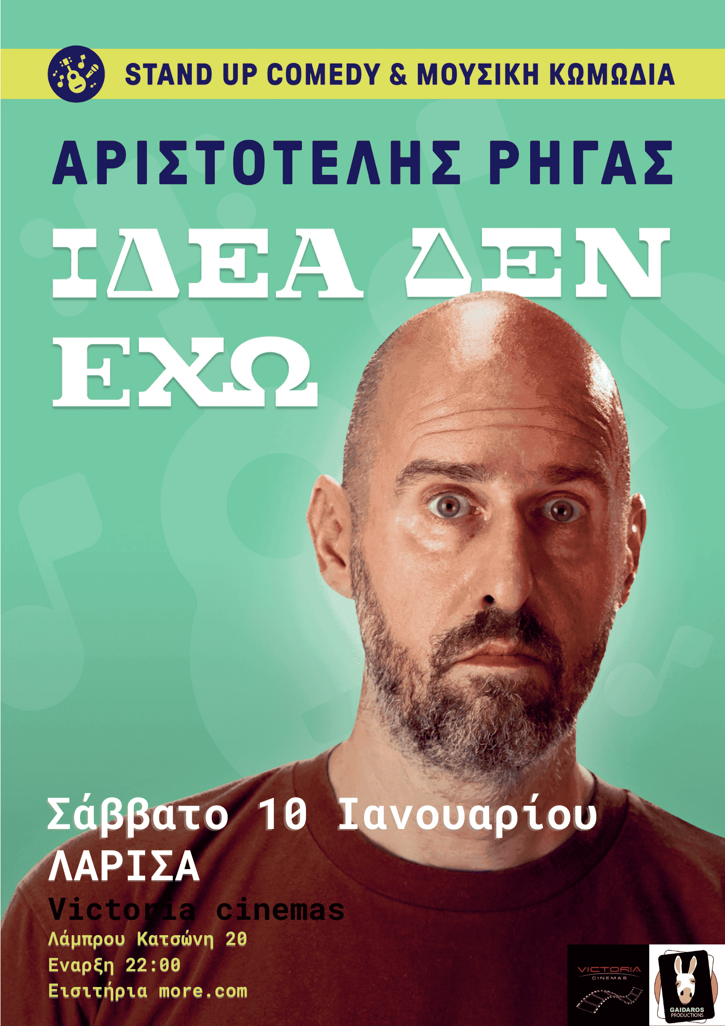 Ο Αριστοτέλης Ρήγας έρχεται στη Λάρισα το Σάββατο 10 Ιανουαρίου με τη νέα του stand up comedy και μουσική κωμωδία με τίτλο «Ιδέα δεν έχω», για μία μοναδική βραδιά γεμάτη χιούμορ, αυτοσαρκασμό και απρόβλεπτες στιγμές.