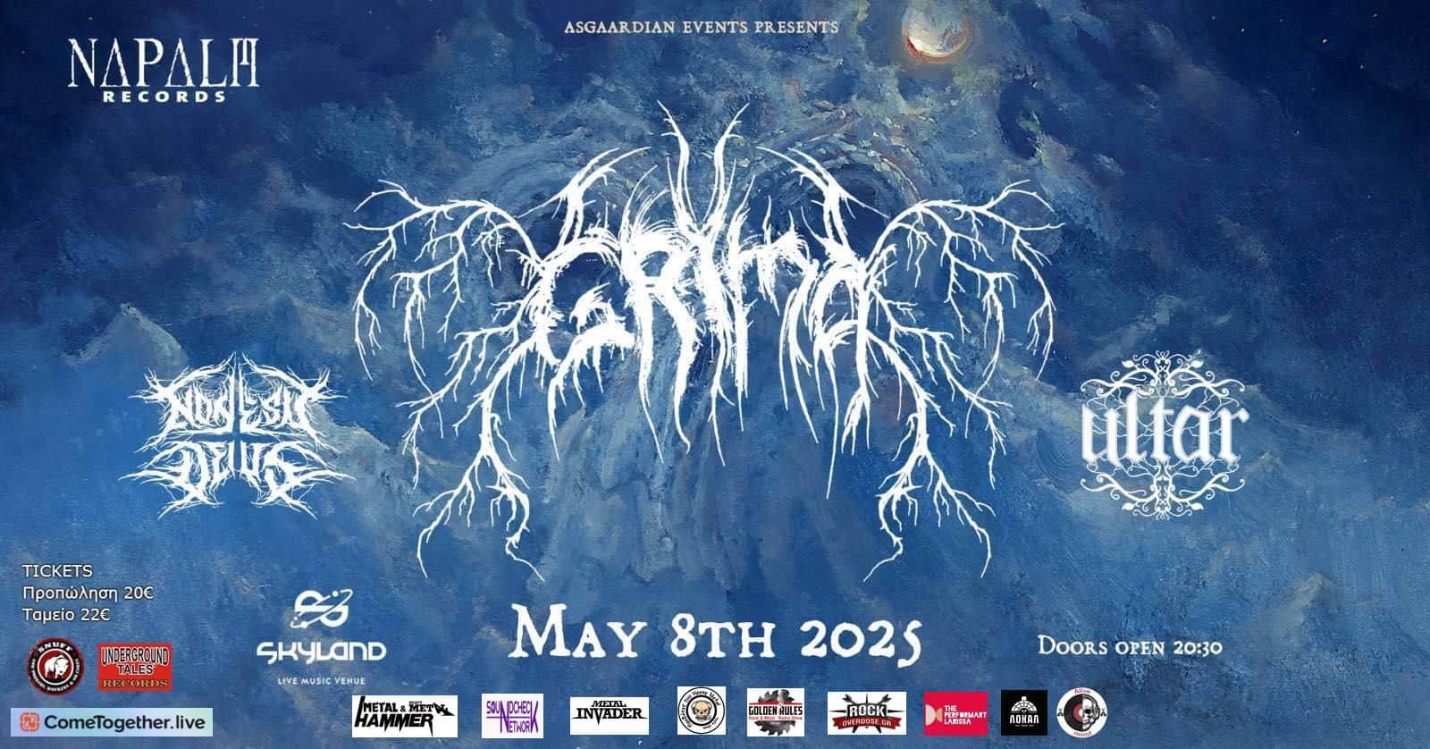 Oι Grima δημιουργήθηκαν το 2014 από τα δίδυμα αδέρφια Gleb και Max Sysoev σαν studio project και έχω ήδη πέντε full length δίσκους κάτω από την ζώνη τους. Μετά την μεγάλη επιτυχία του δίσκου “Will Of The Primordial” του 2019, το συγκρότημα εκτοξεύθηκε στην ατμοσφαιρική black metal σκηνή, εδραιώνοντας τους σαν ένα από τα πλέον ανερχόμενα black metal συγκροτήματα της τελευταίας δεκαετίας. Μετά από πλέον 3 πετυχημένα ευρωπαϊκά tour ήρθε η σειρά της Ελλάδας και της Λάρισας να βιώσει την συναυλιακή εμπειρία που λέγεται “Grima” την Πέμπτη 8 Μαΐου στο Skyland.