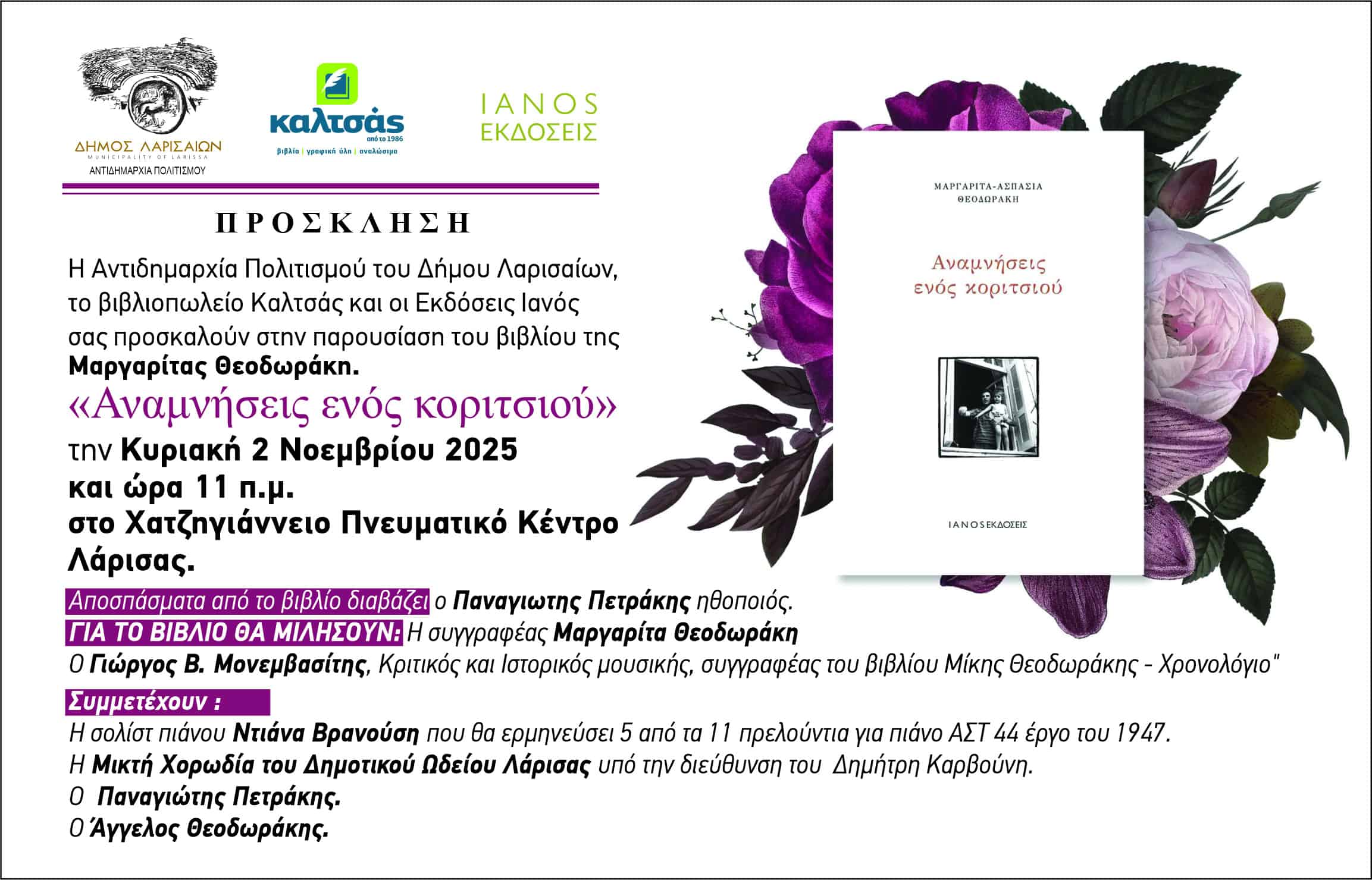 Το βιβλίο της Μαργαρίτας Θεοδωράκη «Αναμνήσεις ενός κοριτσιού» παρουσιάζεται την Κυριακή 2 Νοεμβρίου 2025 και ώρα 11:00 π.μ. στο Χατζηγιάννειο Πνευματικό Κέντρο Λάρισας, από την Αντιδημαρχία Πολιτισμού του Δήμου Λαρισαίων, το βιβλιοπωλείο Καλτσάς και οι Εκδόσεις Ιανός.