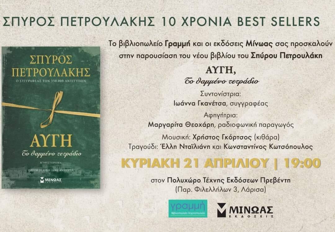 Έρχεται στην Λάρισα ο Σπύρος Πετρουλάκης για την επίσημη παρουσίαση του νέου του βιβλίου “Αυγή, το θαμμένο τετράδιο ” που κυκλοφορεί από τις εκδόσεις Μίνωας. Στις 21 Απριλίου ημέρα Κυριακή και ώρα 19:00 στον πολυχώρο τέχνης των εκδόσεων Πρεβέντη (Πάροδος Φιλελλήνων 3 Λάρισα)