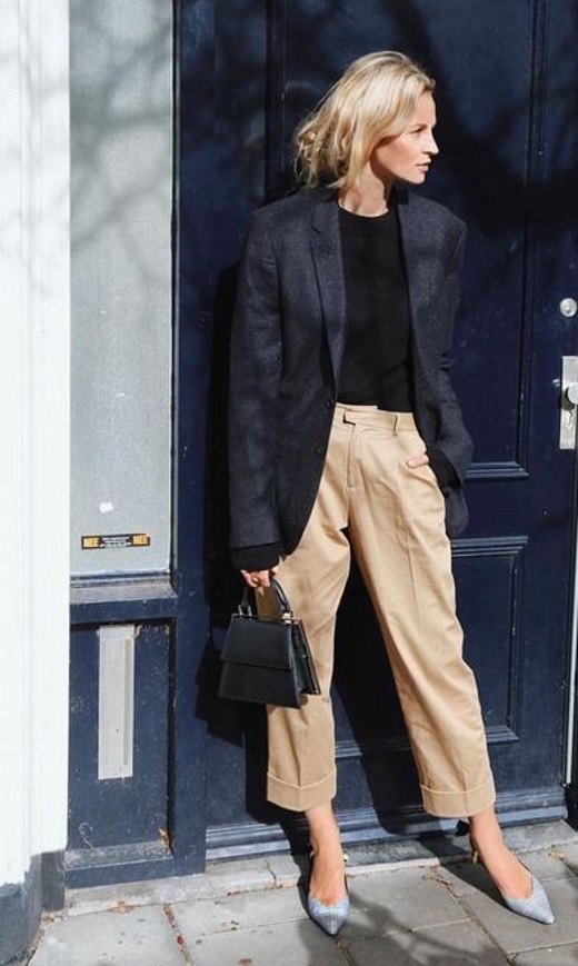Το κλασικό μαύρο blazer σου μπορεί να συνδυαστεί με το μπεζ παντελόνι και να έχεις μία all day εμφάνιση. Πηγαίνεις στο γραφείο, αλλά αν έχεις το σωστό ζευγάρι παπούτσια, μπορείς μετά να πας και για ποτό. Με ένα t-shirt για top έχεις ένα casual look, ενώ με ένα lingerie δημιουργείς ένα βραδινό σύνολο.