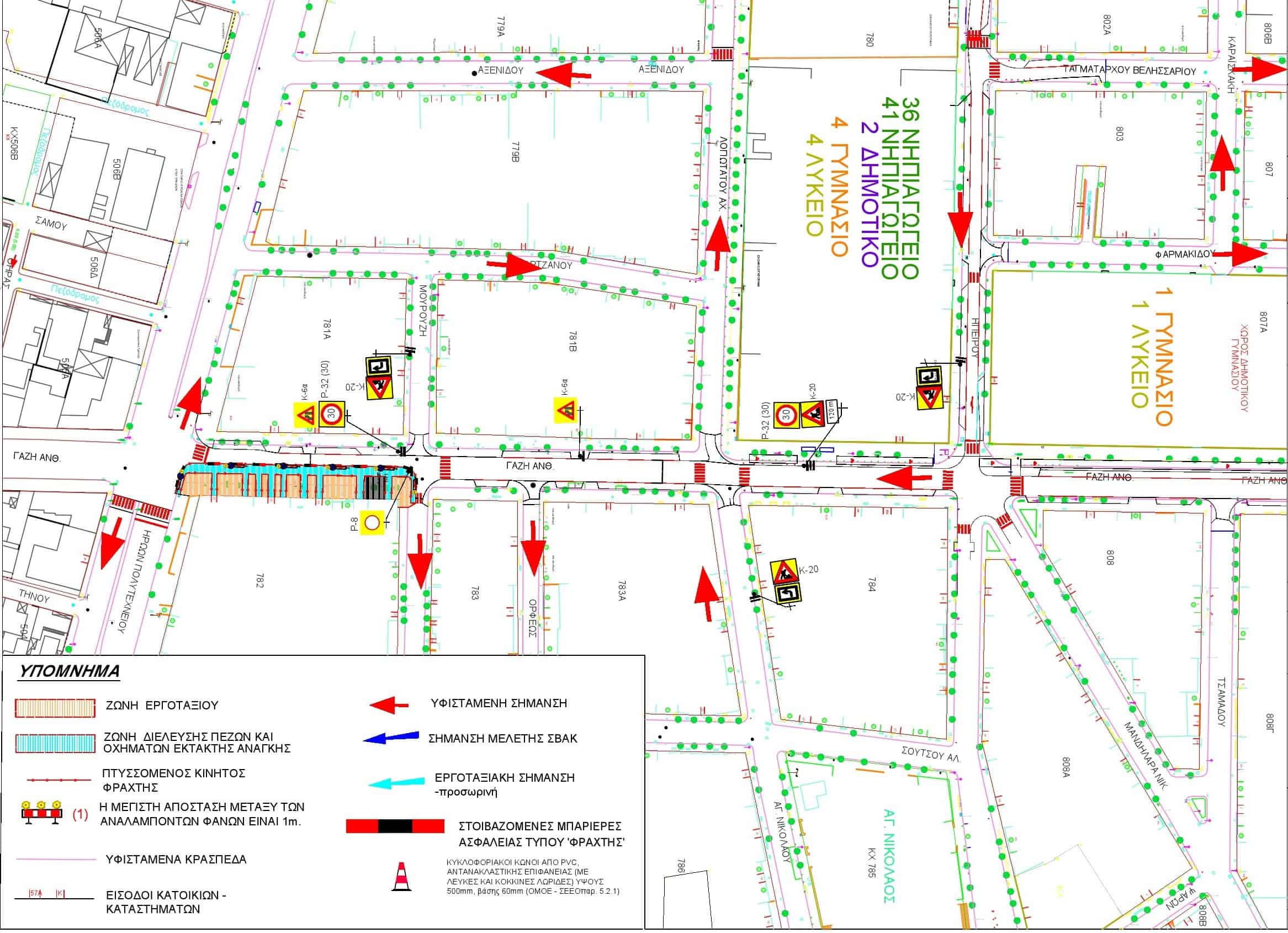 Κατά τη διάρκεια των εργασιών στην οδό Ανθίμου Γαζή, η κυκλοφορία των οχημάτωνθαδιεξάγεται σε μία λωρίδα κυκλοφορίας πλάτους 3,50μ (τοπική μείωση των λωρίδωνκυκλοφορίας από δύο σε μία, λόγω της στένωσης του οδοστρώματος στην αριστερήπλευρά της οδού κατά τη φορά κίνησης των οχημάτων, από την οδό Μουρούζη προς τηνοδό Ηρώων Πολυτεχνείου) και θα γίνεται σύμφωνα με τις προβλεπόμενες πληροφοριακέςκαι ρυθμιστικέςπινακίδες που θα τοποθετηθούν από τον ανάδοχο του έργου.