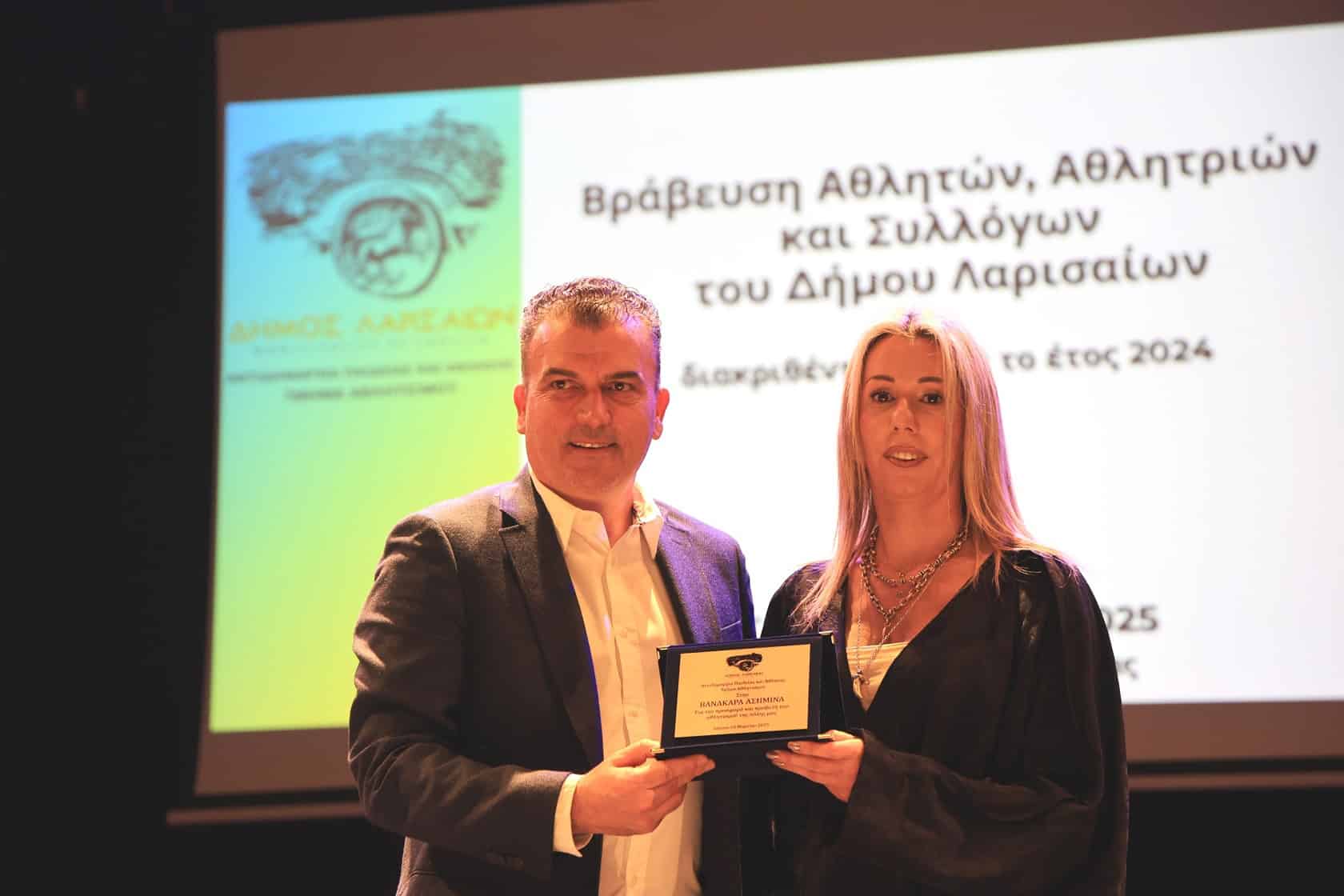 Μια βραδιά γεμάτη αναμνήσεις, επιτυχίες και συγκίνηση επιφύλασσε η τελετή βράβευσης αθλητριών, αθλητών, συλλόγων και φορέων του Αθλητισμού της Λάρισας, που διοργάνωσε ο Δήμος Λαρισαίων, η Αντιδημαρχία Παιδείας & Άθλησης και το Τμήμα Αθλητισμού, την Τρίτη, στο κατάμεστο Δημοτικό Ωδείο Λάρισας.