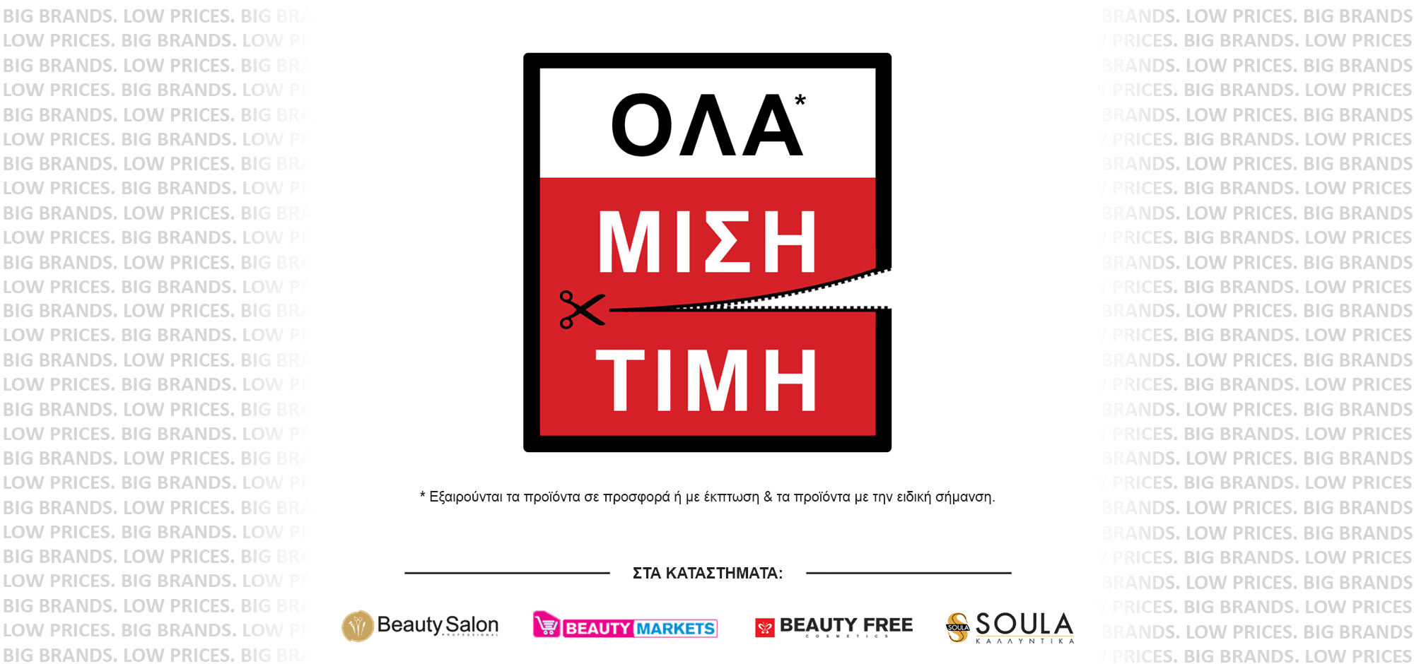 Ο Όμιλος GBG αποχαιρετά το φετινό καλοκαίρι με ΌΛΑ τα προϊόντα ομορφιάς στη ΜΙΣΗ ΤΙΜΗ! Πάντα με γνώμονα τις ανάγκες του καταναλωτικού κοινού, δημιουργεί την απόλυτη έκπληξη με έκπτωση -50% σε όλα τα προϊόντα από σήμερα Δευτέρα 20 Αυγούστου έως και τέλη του μήνα, στα τοπικά καταστήματα: SOULA, BEAUTY FREE, BEAUTY MARKETS και BEAUTY SALON.
